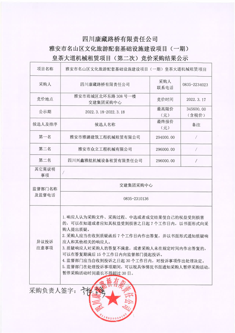 四川康藏路橋有限責任公司雅安市名山區(qū)文化旅游配套基礎設施建設項目(一期)皇茶大道機械租賃項目(第二次)競價采購結果公示