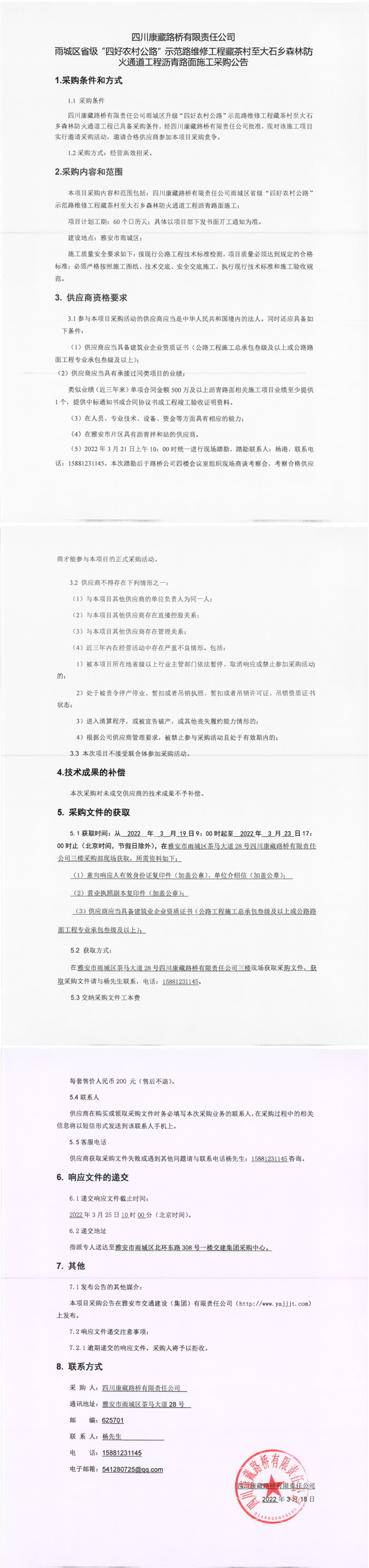 四川康藏路橋有限責(zé)任公司雨城區(qū)省級“四好農(nóng)村公路”示范路維修工程藏茶村至大石鄉(xiāng)森林防火通道工程瀝青路面施工采購公告