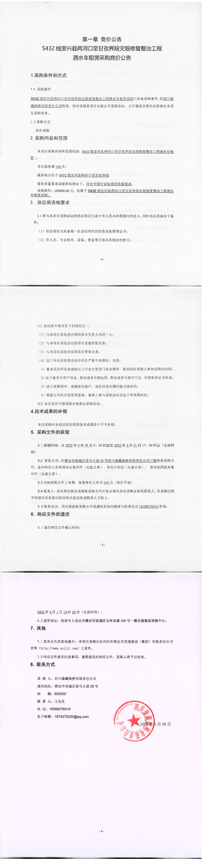 四川康藏路橋有限責(zé)任公司S432線寶興縣兩河口至甘孜界段災(zāi)毀修復(fù)整治工程灑水車租賃采購競價(jià)公告