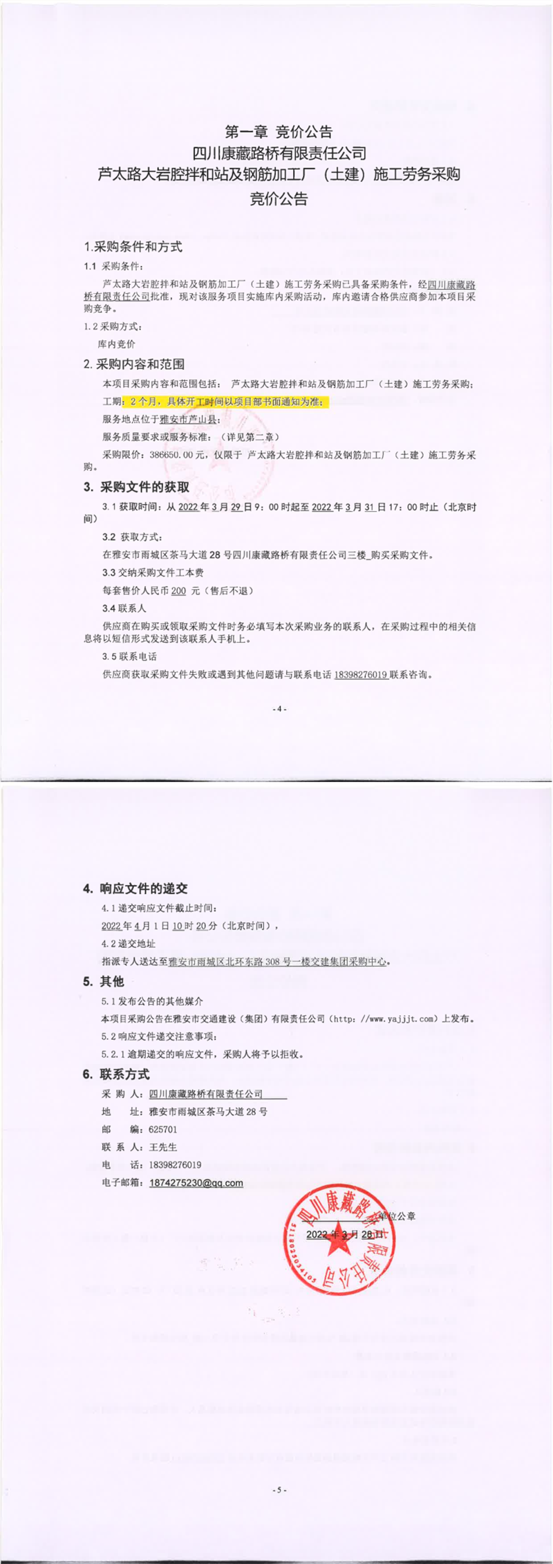 四川康藏路橋有限責(zé)任公司蘆太路大巖腔拌和站及鋼筋加工廠(土建)施工勞務(wù)采購競(jìng)價(jià)公告