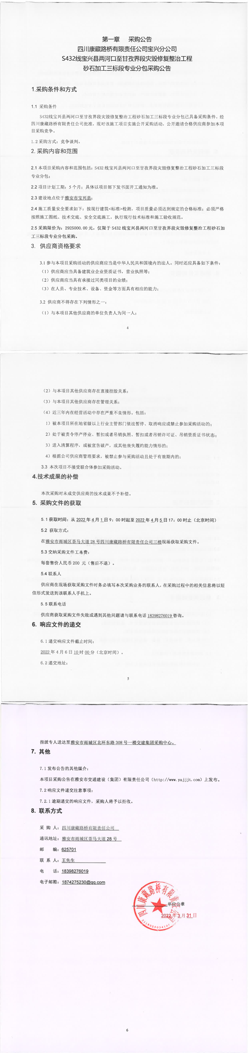 四川康藏路橋有限責(zé)任公司S432線(xiàn)寶興縣兩河口至甘孜界段災(zāi)毀修復(fù)整治工程砂石加工三標(biāo)段專(zhuān)業(yè)分包采購(gòu)公告
