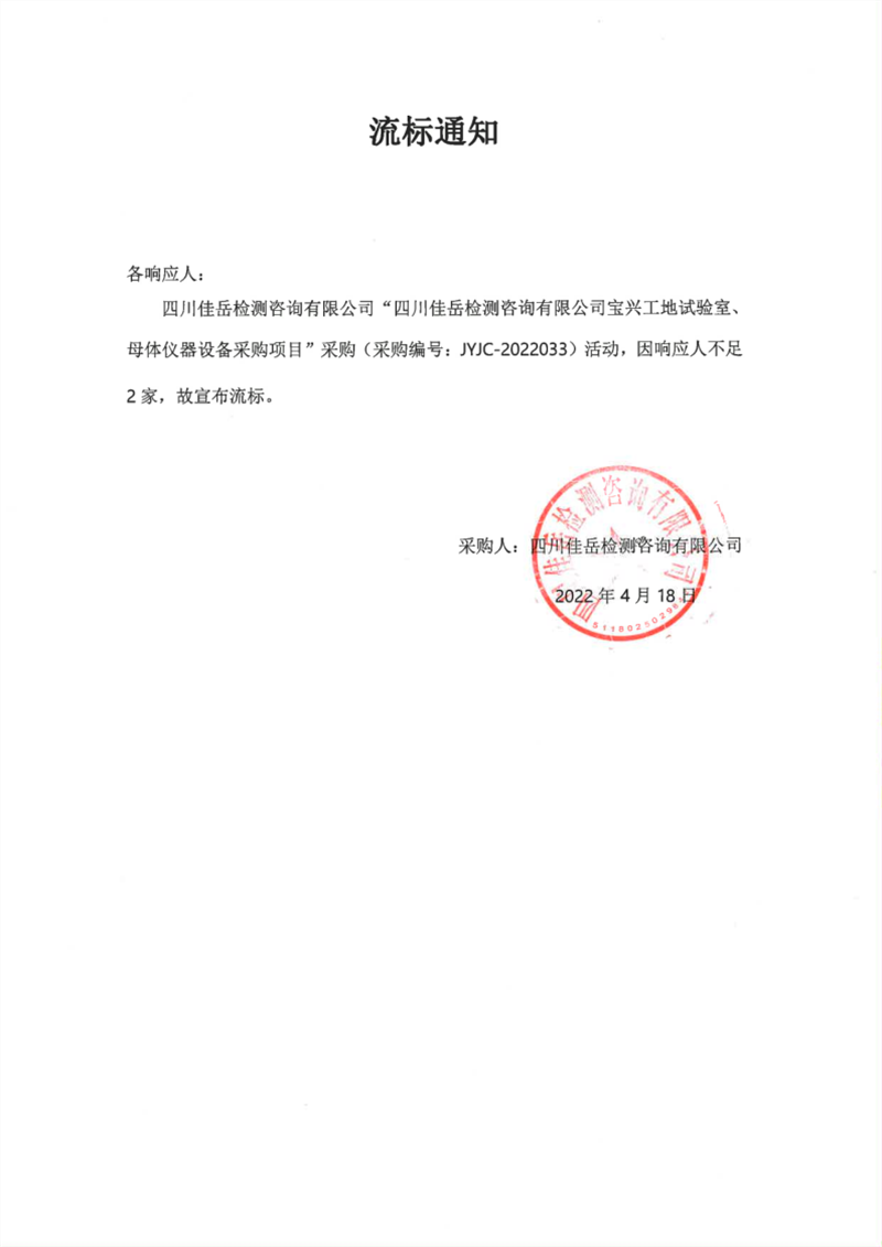 四川佳岳檢測(cè)咨詢有限公司寶興工地試驗(yàn)室、母體儀器設(shè)備采購項(xiàng)目流標(biāo)通知