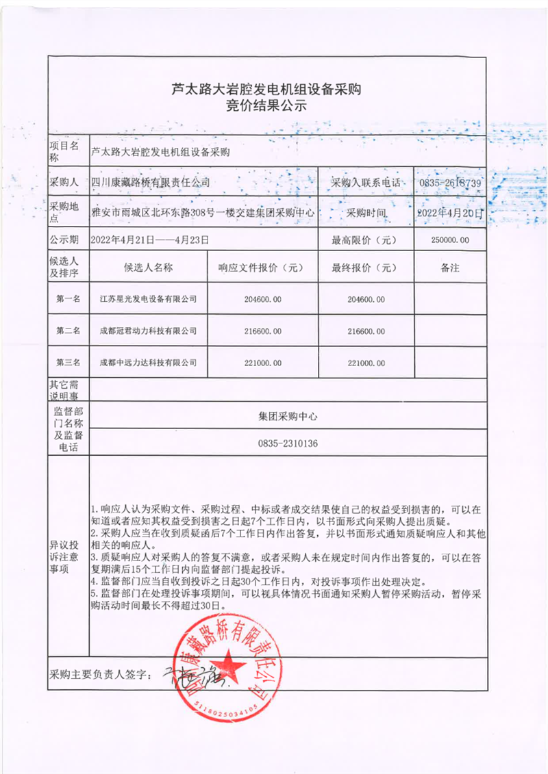 四川康藏路橋有限責任公司蘆太路大巖腔發(fā)電機組設備采購競價結(jié)果公示