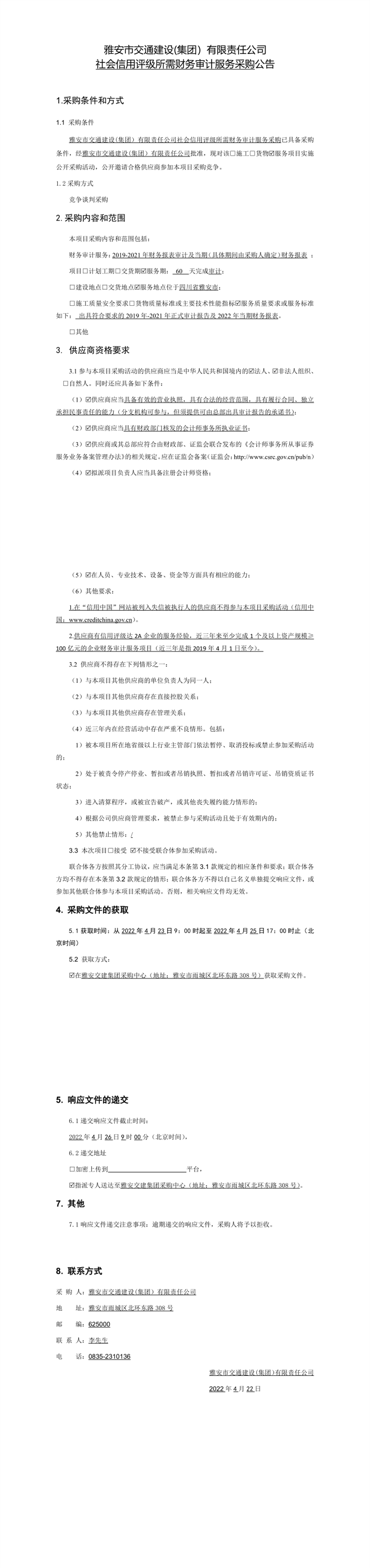 雅安市交通建設(shè)(集團(tuán))有限責(zé)任公司社會(huì)信用評級所需財(cái)務(wù)審計(jì)服務(wù)采購公告