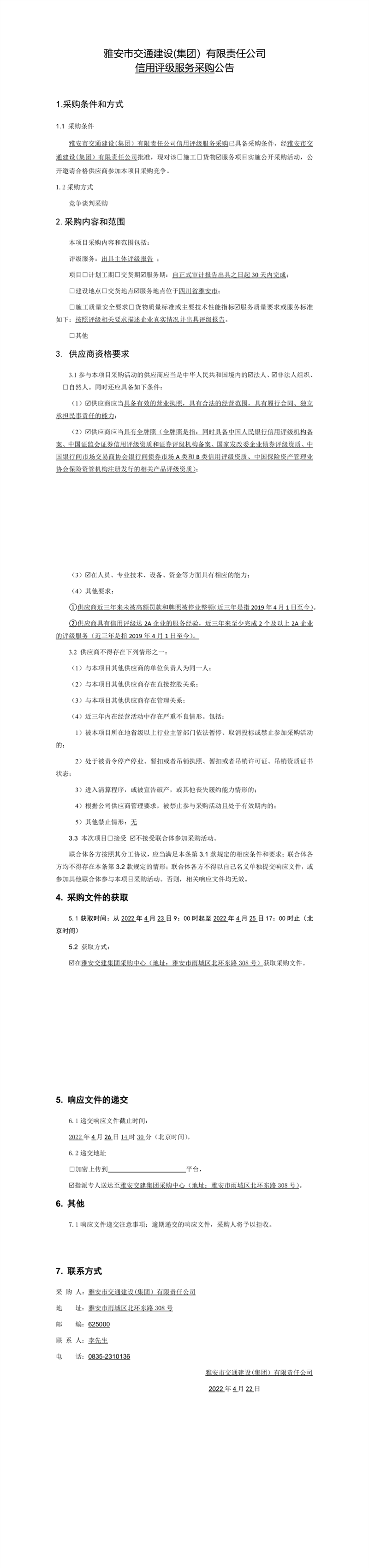 雅安市交通建設(shè)(集團(tuán))有限責(zé)任公司信用評(píng)級(jí)服務(wù)采購公告