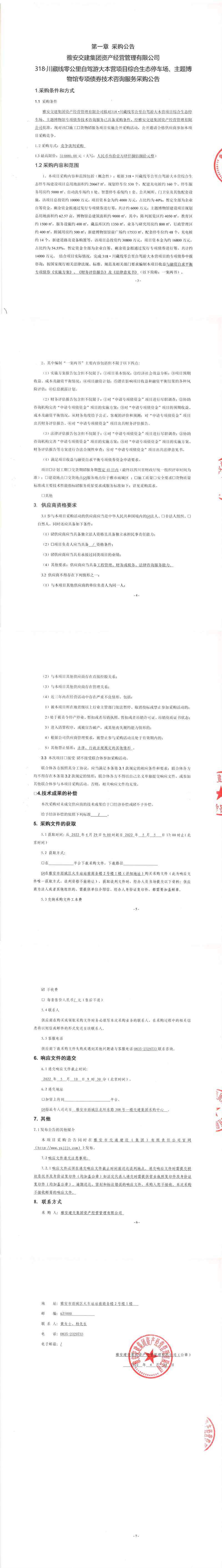 雅安交建集團資產(chǎn)經(jīng)營管理有限公司318.川藏線零公里自駕游大本營項目綜合生態(tài)停車場、主題博物館專項債券技術咨詢服務采購公告