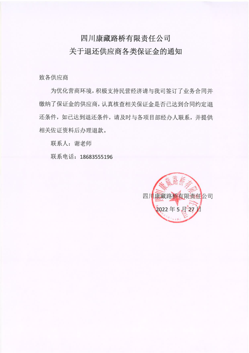 四川康藏路橋有限責(zé)任公司關(guān)于退還供應(yīng)商各類(lèi)保證金的通知