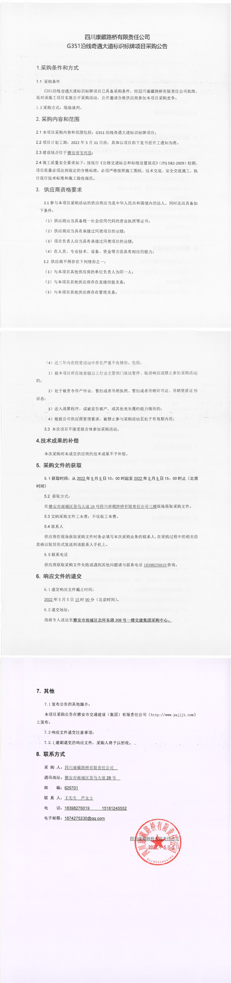 四川康藏路橋有限責(zé)任公司G351沿線奇遇大道標(biāo)識(shí)標(biāo)牌項(xiàng)目采購(gòu)公告