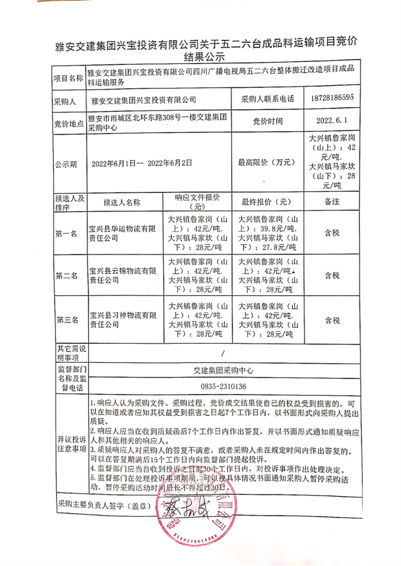 雅安交建集團(tuán)興寶投資有限公司關(guān)于五二六臺成品料運輸項目競價結(jié)果公示