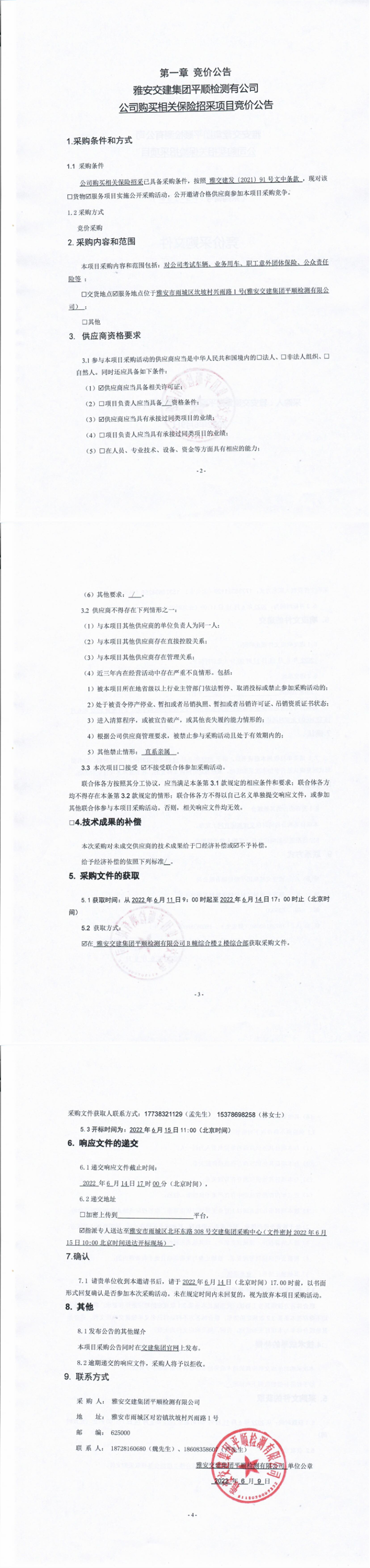 雅安交建集團(tuán)平順檢測有限公司公司購買相關(guān)保險(xiǎn)招采項(xiàng)目競價(jià)公告
