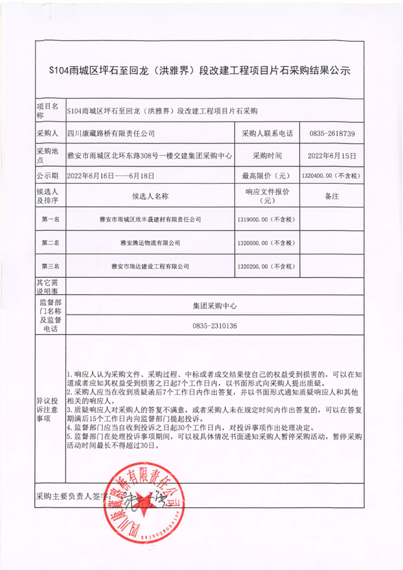 四川康藏路橋有限責(zé)任公司S104雨城區(qū)坪石至回龍(洪雅界)段改建工程項(xiàng)目片石采購(gòu)結(jié)果公示