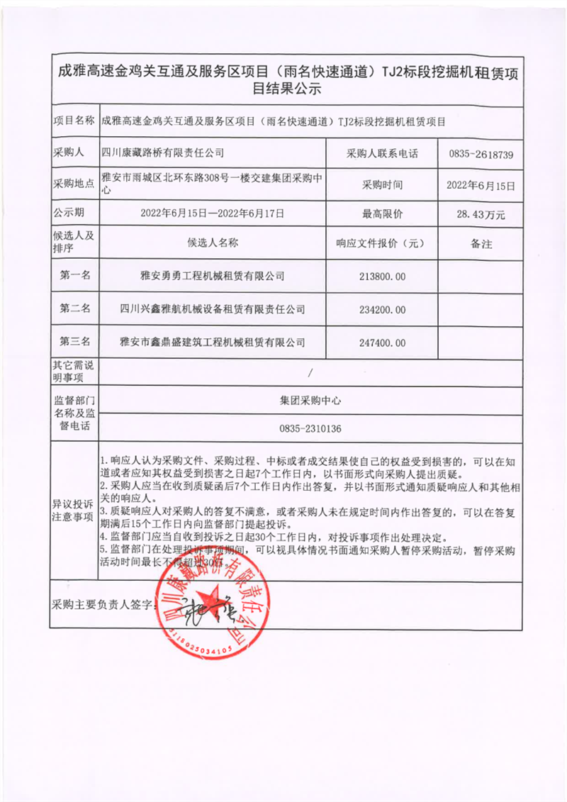 四川康藏路橋有限責(zé)任公司成雅高速金雞關(guān)互通及服務(wù)區(qū)項(xiàng)目(雨名快速通道)TJ2標(biāo)段挖掘機(jī)租賃項(xiàng)目結(jié)果公示