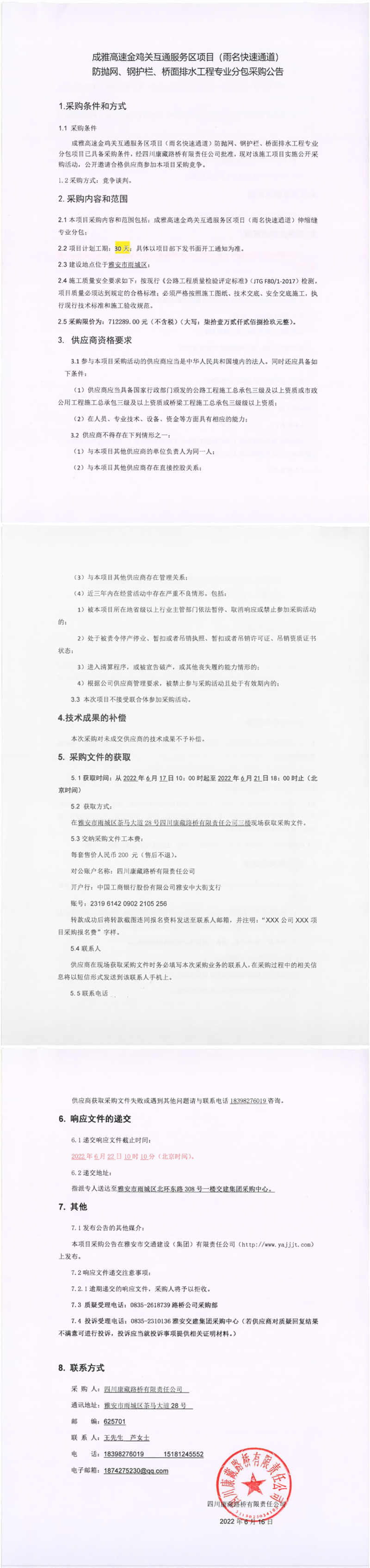 四川康藏路橋有限責(zé)任公司成雅高速金雞關(guān)互通服務(wù)區(qū)項目(雨名快速通道)防拋網(wǎng)、鋼護(hù)欄、橋面排水工程專業(yè)分包采購公告