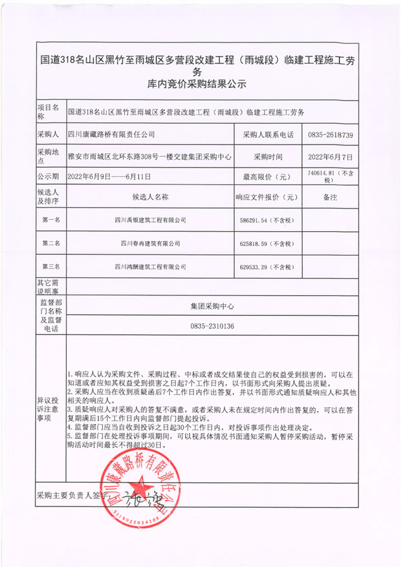 四川康藏路橋有限責(zé)任公司國道318名山區(qū)黑竹至雨城區(qū)多營段改建工程(雨城段)臨建工程施工勞務(wù)庫內(nèi)競價采購結(jié)果公示