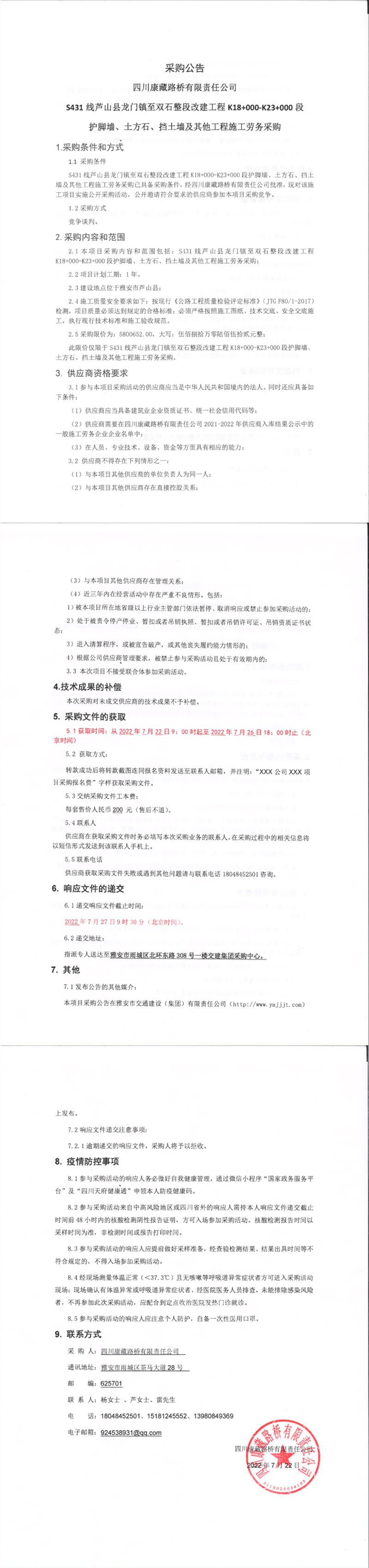 四川康藏路橋有限責(zé)任公司S431線蘆山縣龍門(mén)鎮(zhèn)至雙石整段改建工程K18+000-K23+000段護(hù)腳墻、土方石、擋土墻及其他工程施工勞務(wù)采購(gòu)