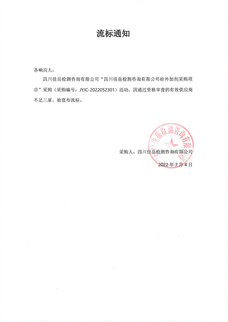 四川佳岳檢測(cè)咨詢有限公司砼外加劑采購(gòu)項(xiàng)目流標(biāo)通知