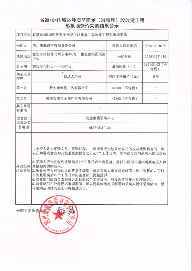 四川康藏路橋有限責(zé)任公司省道104雨城區(qū)坪石至回龍(洪雅界)段改建工程形象墻競價(jià)采購結(jié)果公示