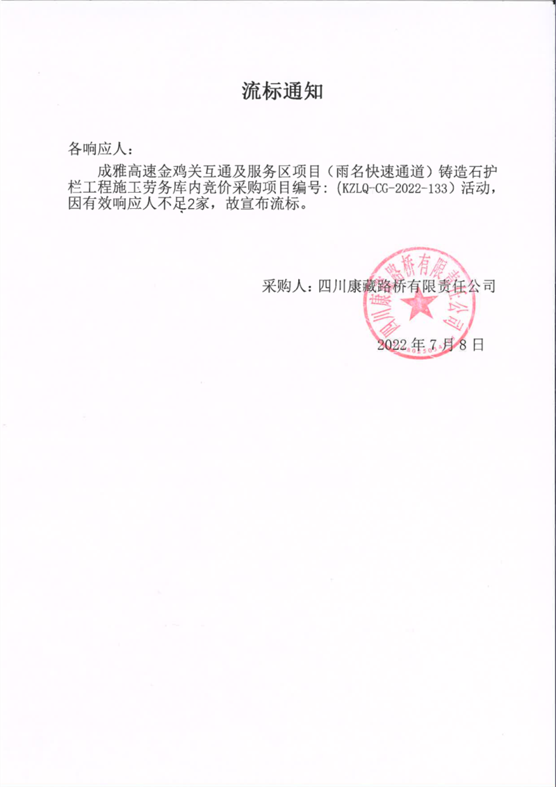 四川康藏路橋有限責任公司成雅高速金雞關互通及服務區(qū)項目(雨名快速通道)鑄造石護欄施工勞務庫內(nèi)競價采購項目流標通知