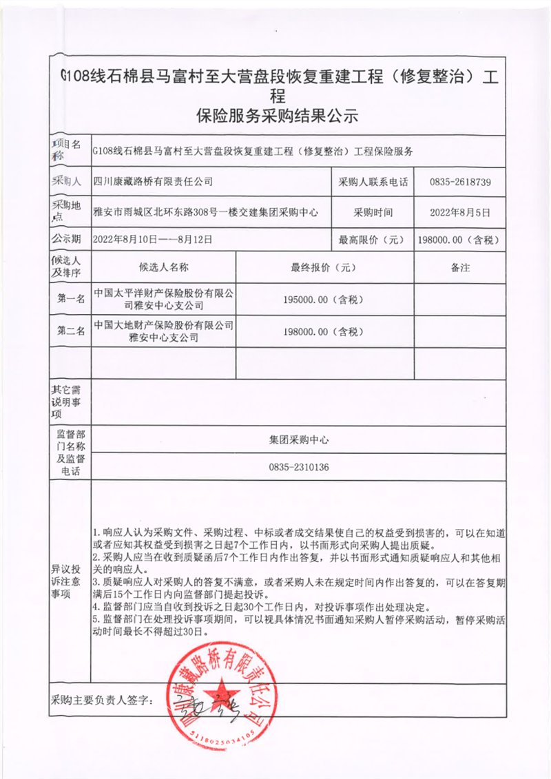 四川康藏路橋有限責(zé)任公司G108線石棉縣馬富村至大營(yíng)盤段恢復(fù)重建工程(修復(fù)整治)工程保險(xiǎn)服務(wù)采購(gòu)結(jié)果公示