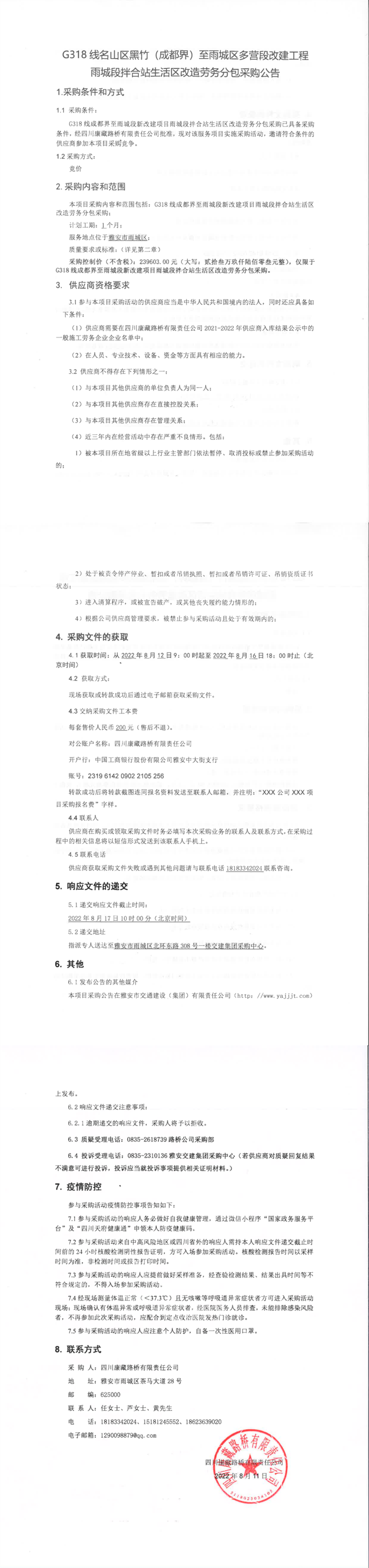 四川康藏路橋有限責任公司G318線名山區(qū)黑竹(成都界)至雨城區(qū)多營段改建工程雨城段拌合站生活區(qū)改造勞務(wù)分包采購公告