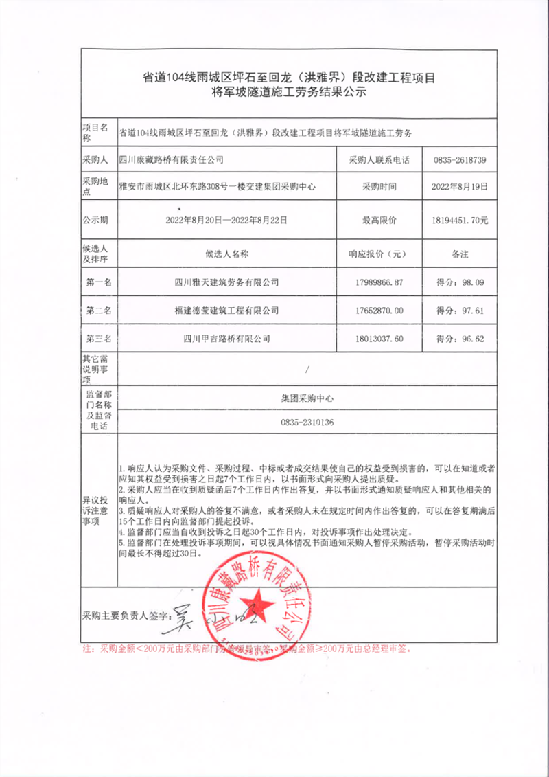 四川康藏路橋有限責(zé)任公司省道104線雨城區(qū)坪石至回龍(洪雅界)段改建工程項目將軍坡隧道施工勞務(wù)結(jié)果公示