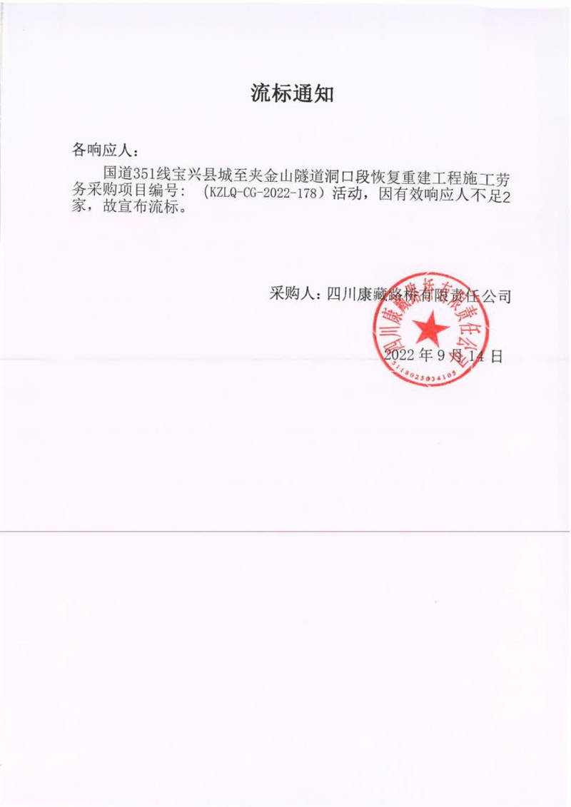 四川康藏路橋有限責(zé)任公司國道351線寶興縣城至夾金山隧道洞口段恢復(fù)重建工程施工勞務(wù)采購流標通知
