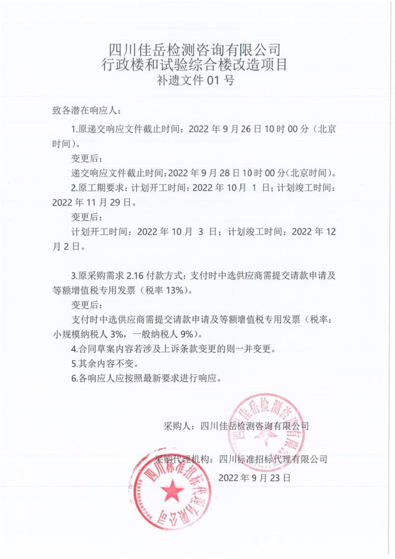 四川佳岳檢測咨詢有限公司行政樓和試驗(yàn)綜合樓改造項(xiàng)目補(bǔ)遺文件01號(hào)