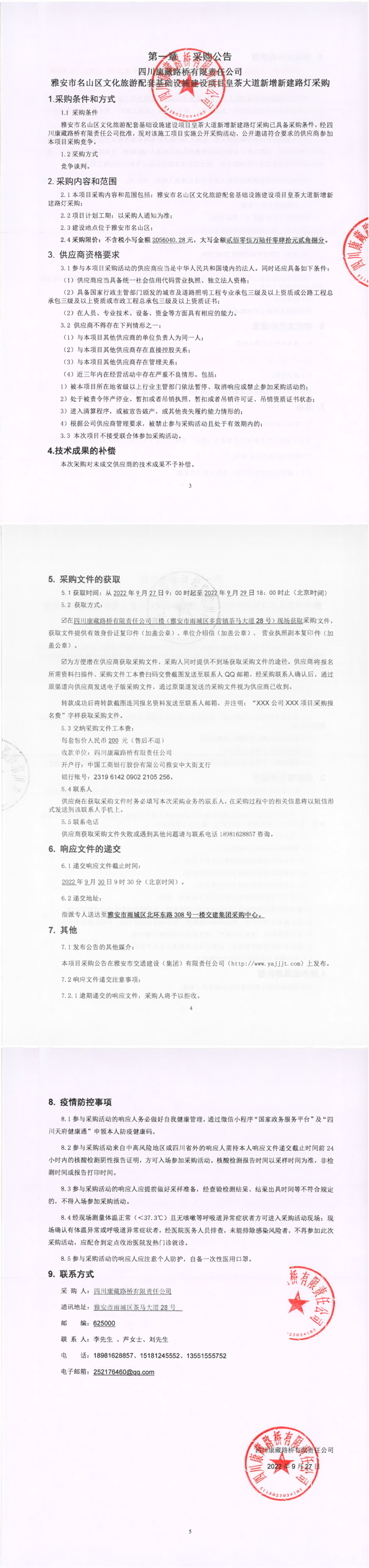 四川康藏路橋有限責(zé)任公司雅安市名山區(qū)文化旅游配套基礎(chǔ)設(shè)施建設(shè)項目皇茶大道新增新建路燈采購公告