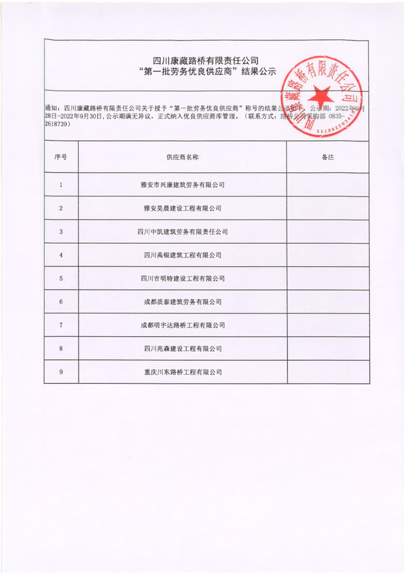 四川康藏路橋有限責任公司“第一批勞務(wù)優(yōu)良供應(yīng)商”結(jié)果公示