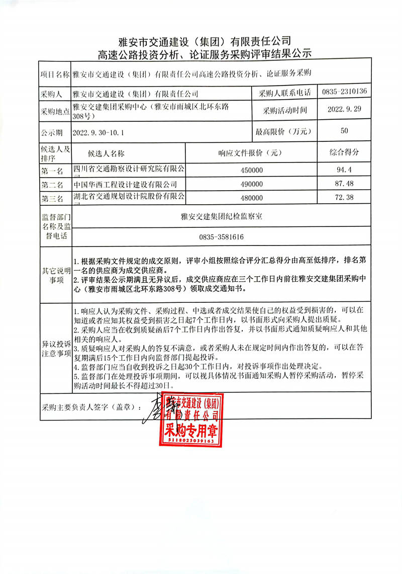 雅安市交通建設(shè)(集團)有限責(zé)任公司高速公路投資分析、論證服務(wù)采購評審結(jié)果公示