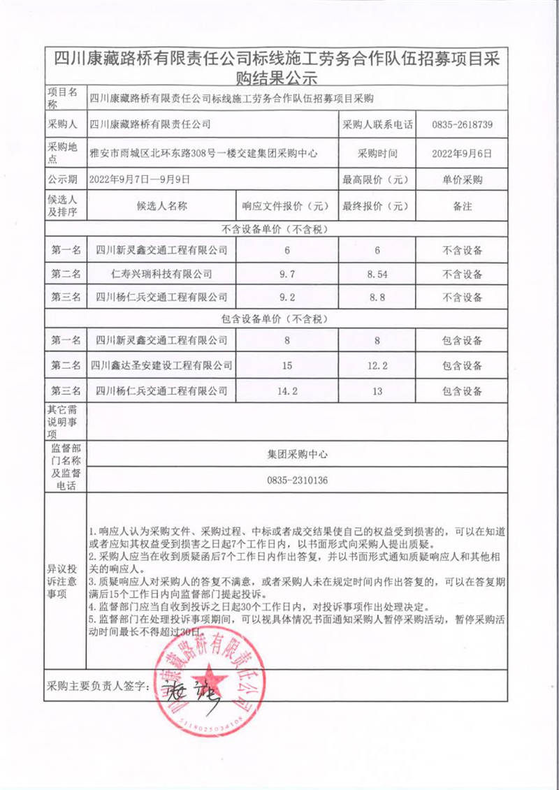 四川康藏路橋有限責任公司標線施工勞務(wù)合作隊伍招募項目采購結(jié)果公示