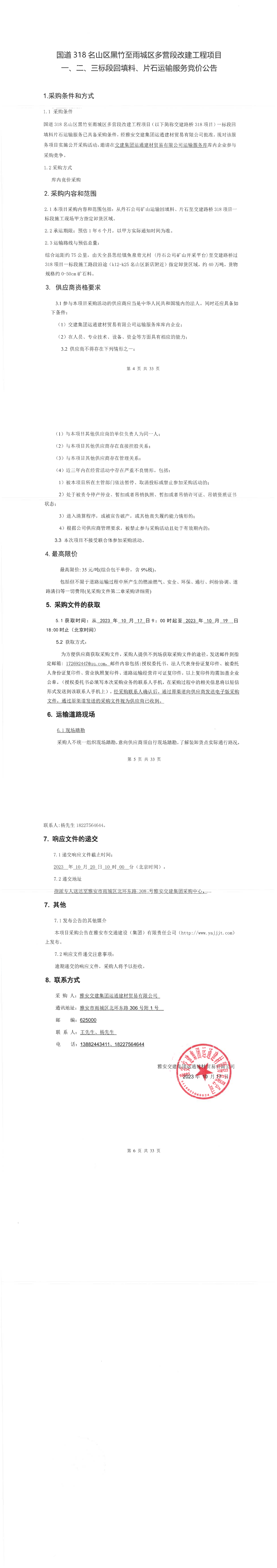 雅安交建集團(tuán)運(yùn)通建材貿(mào)易有限公司國道名山區(qū)黑竹至雨城區(qū)多營段改建工程項(xiàng)目一、二、三標(biāo)段回填料、片石運(yùn)輸服務(wù)競價(jià)公告