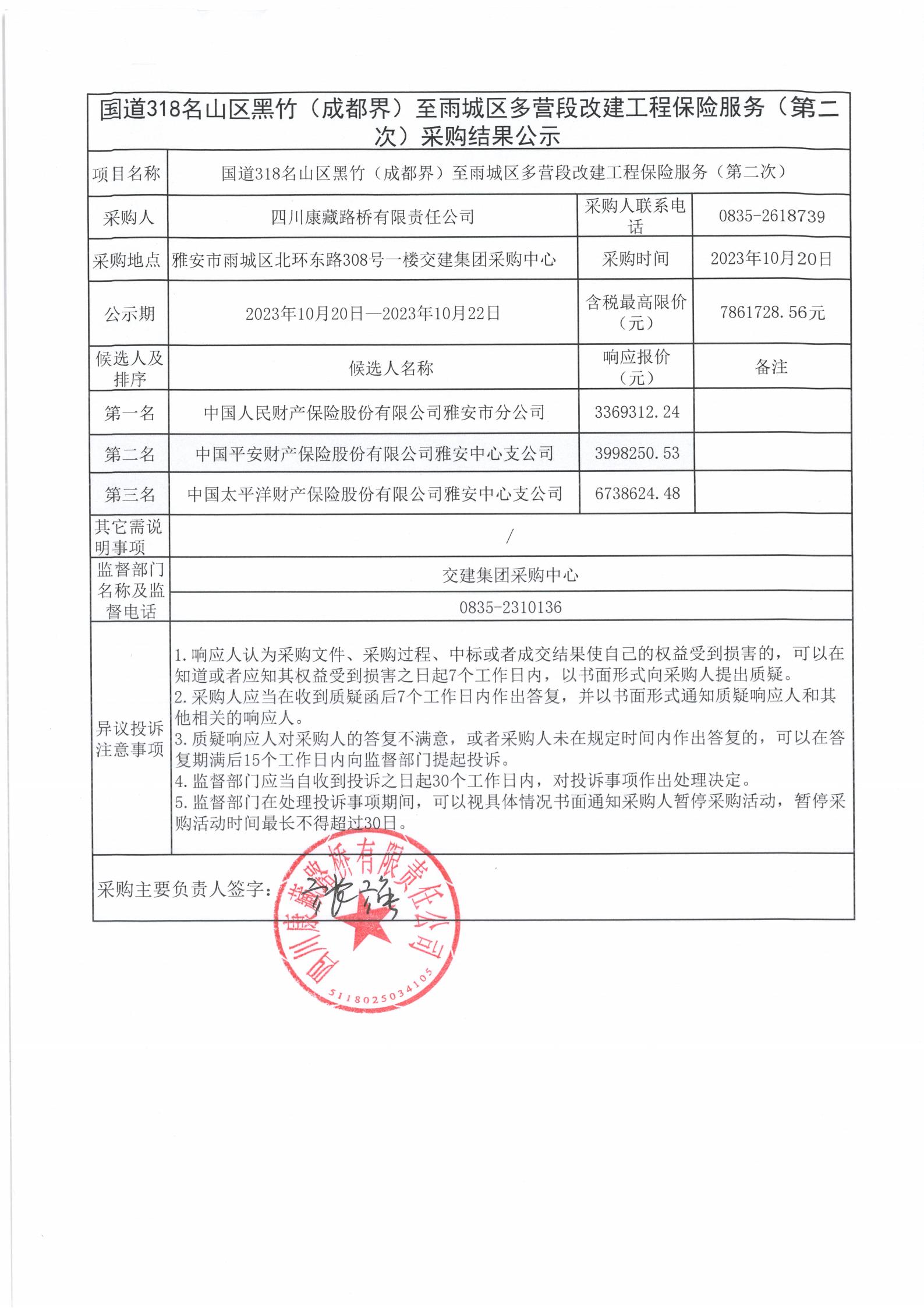 四川康藏路橋有限責任公司國道318名山區(qū)黑竹(成都界)至雨城區(qū)多營段改建工程保險服務(第二次)采購結果公示