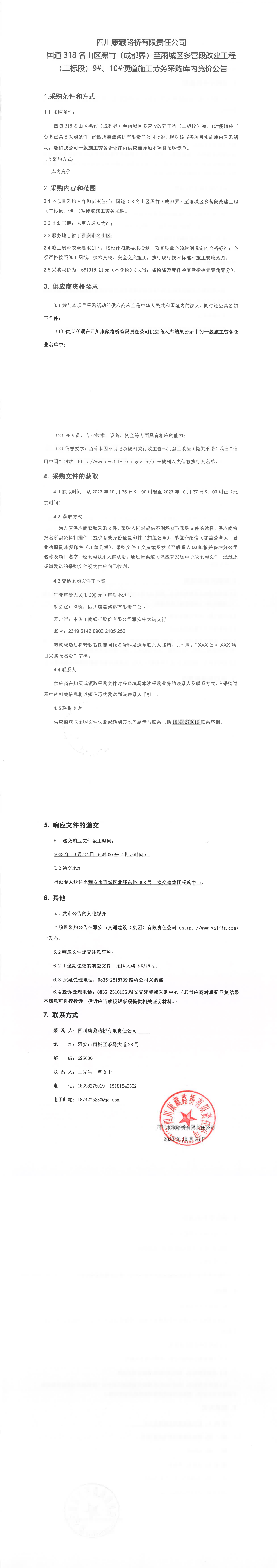 四川康藏路橋有限責(zé)任公司國(guó)道318名山區(qū)黑竹(成都界)至雨城區(qū)多營(yíng)段改建工程(二標(biāo)段)9#、10#便道施工勞務(wù)采購庫內(nèi)競(jìng)價(jià)公告