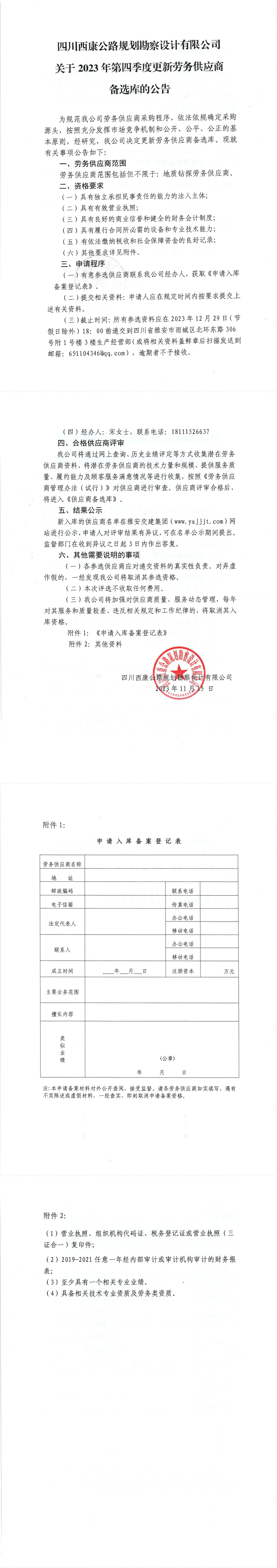 四川西康公路規(guī)劃勘察設(shè)計(jì)有限公司關(guān)于2023年第四季度更新勞務(wù)供應(yīng)商備選庫(kù)的公告