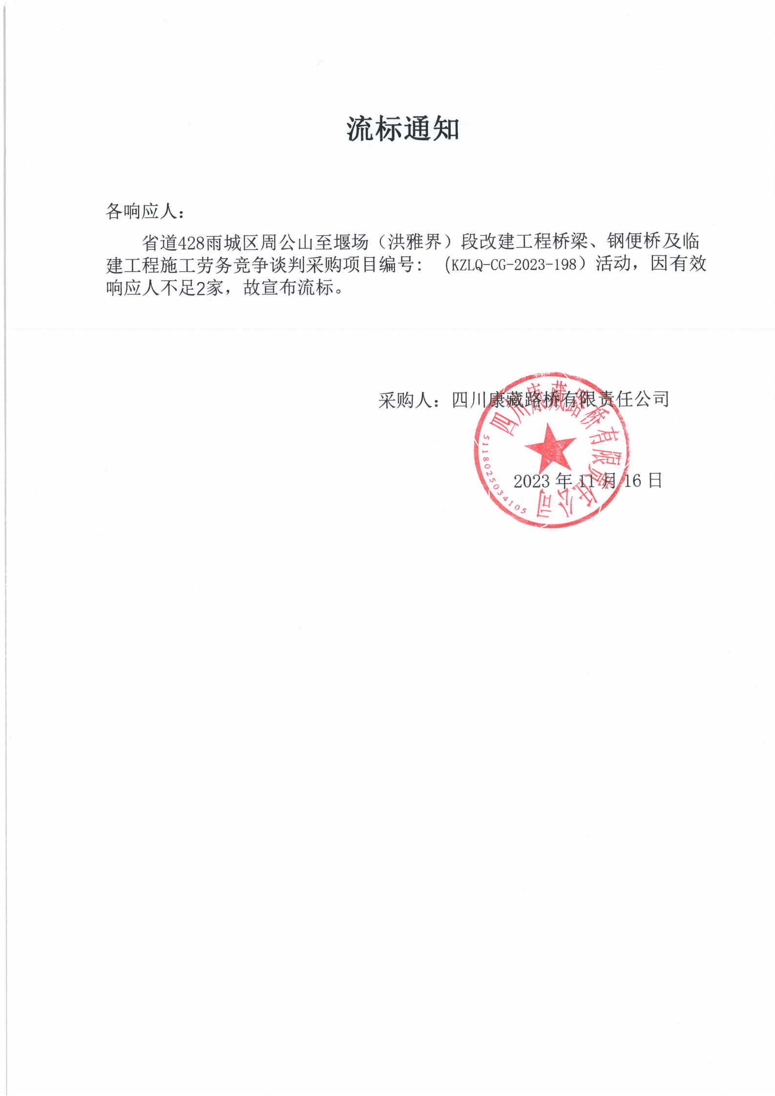 四川康藏路橋有限責任公司省道428雨城區(qū)周公山至堰場(洪雅界)段改建工程橋梁、鋼便橋及臨建工程施工勞務采購流標通知