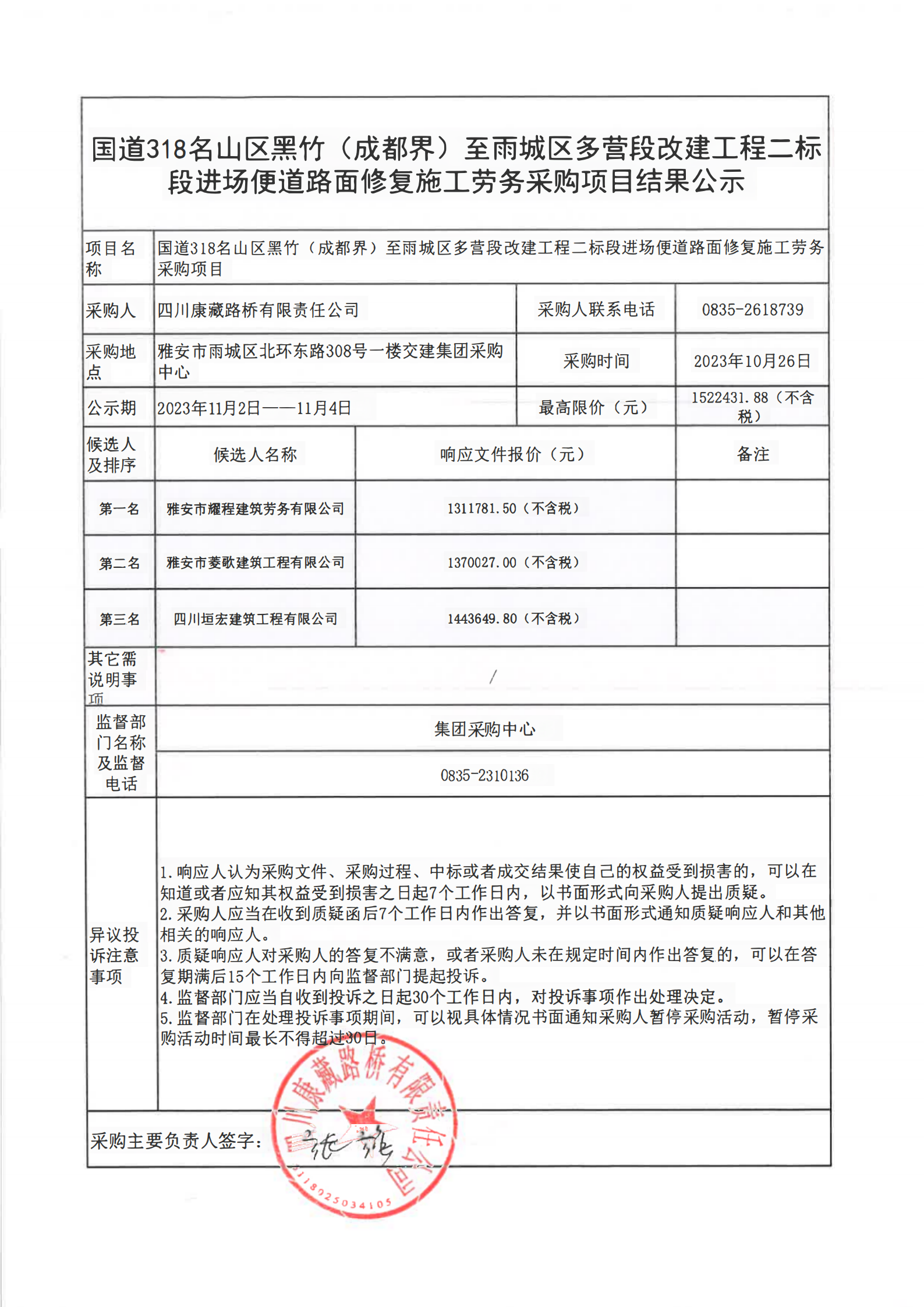 四川康藏路橋有限責(zé)任公司國道318名山區(qū)黑竹(成都界)至雨城區(qū)多營段改建工程二標(biāo)段進場便道路面修復(fù)施工勞務(wù)采購項目結(jié)果公示
