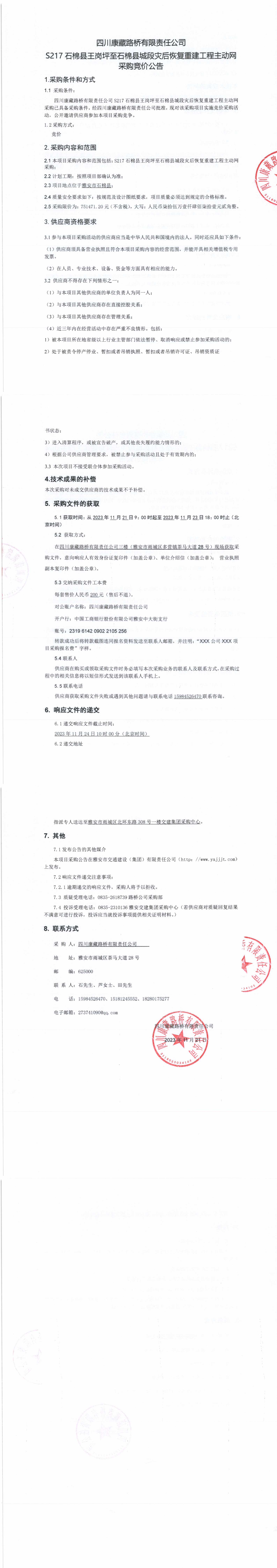 四川康藏路橋有限責任公司S217石棉縣王崗坪至石棉縣城段災后恢復重建工程主動網(wǎng)采購公告