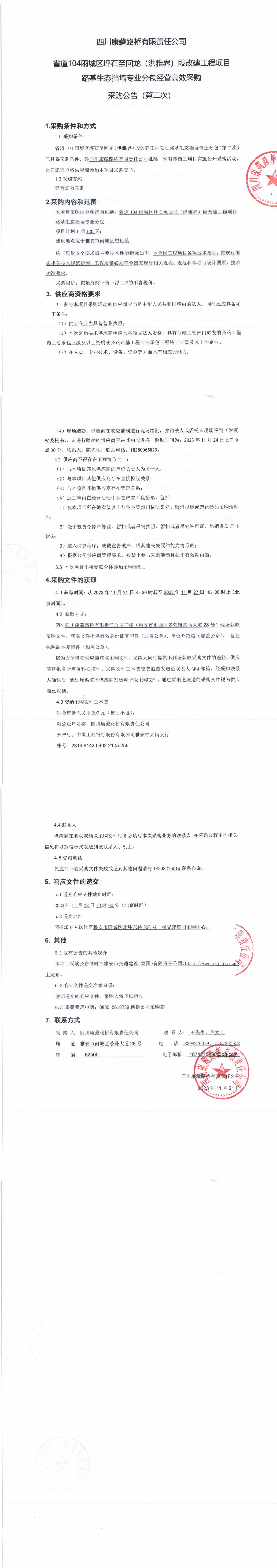 四川康藏路橋有限責(zé)任公司省道104雨城區(qū)坪石至回龍(洪雅界)段改建工程項目路基生態(tài)擋墻專業(yè)分包經(jīng)營高效采購(第二次)采購公告