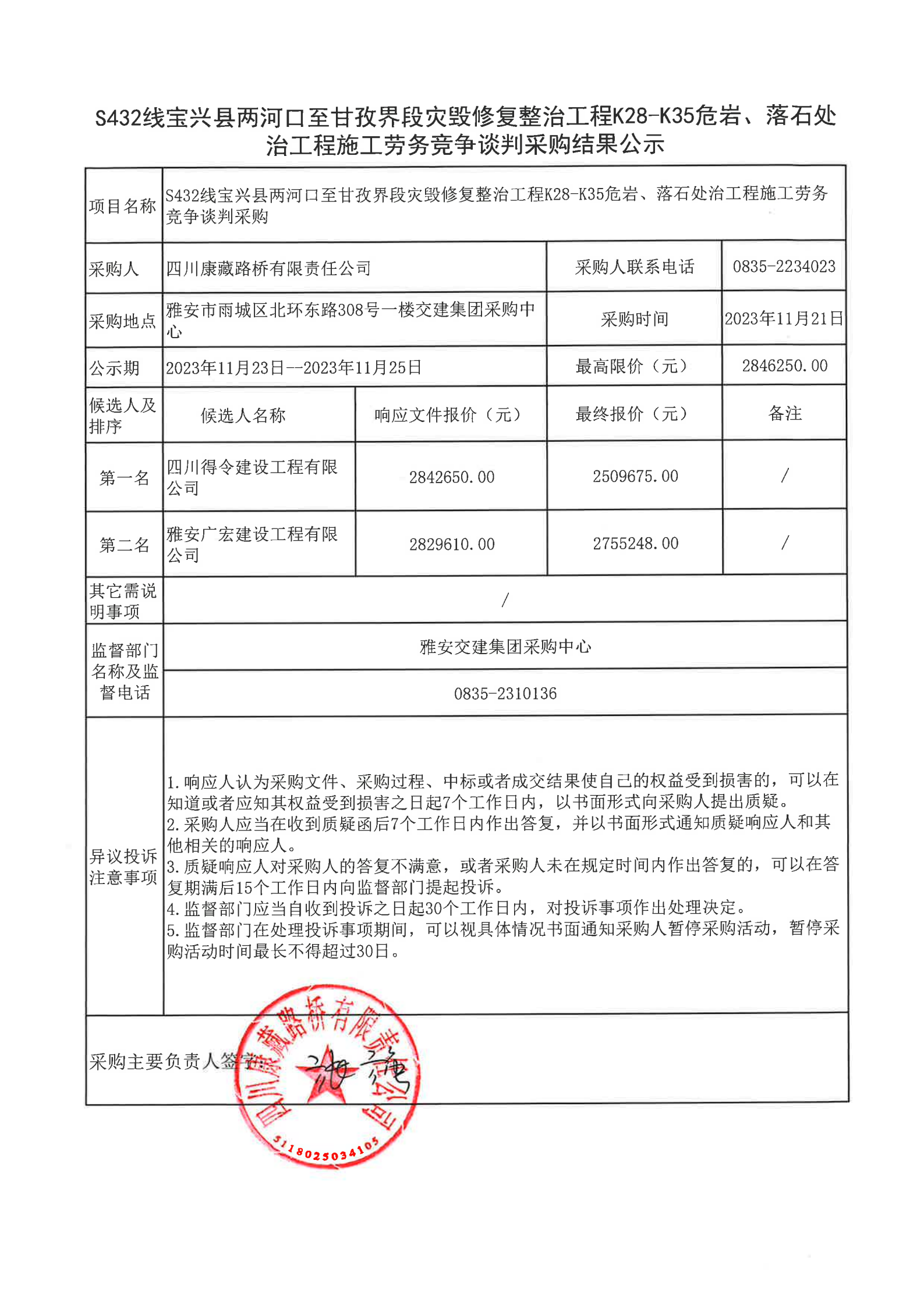 四川康藏路橋有限責任公司S432線寶興縣兩河口至甘孜界段災毀修復整治工程K28-K35危巖、落石處治工程施工勞務競爭談判采購結(jié)果公示