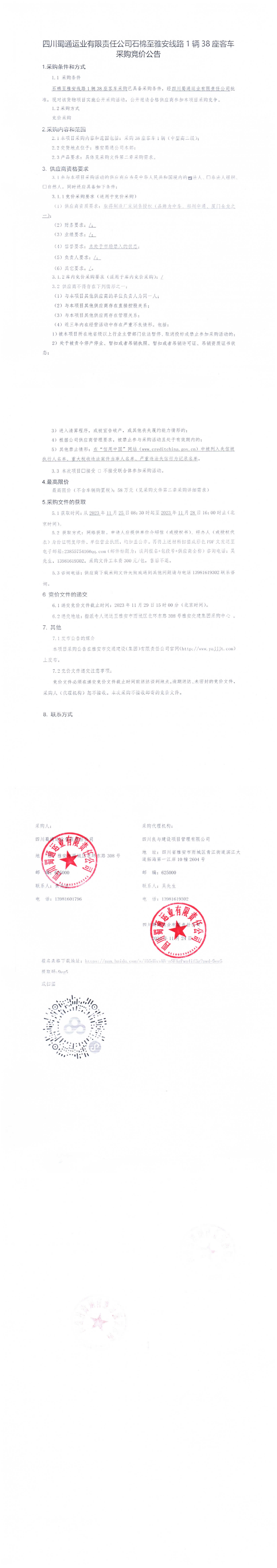 四川蜀通運業(yè)有限責任公司石棉縣至雅安線路1輛38座客車采購競價公告