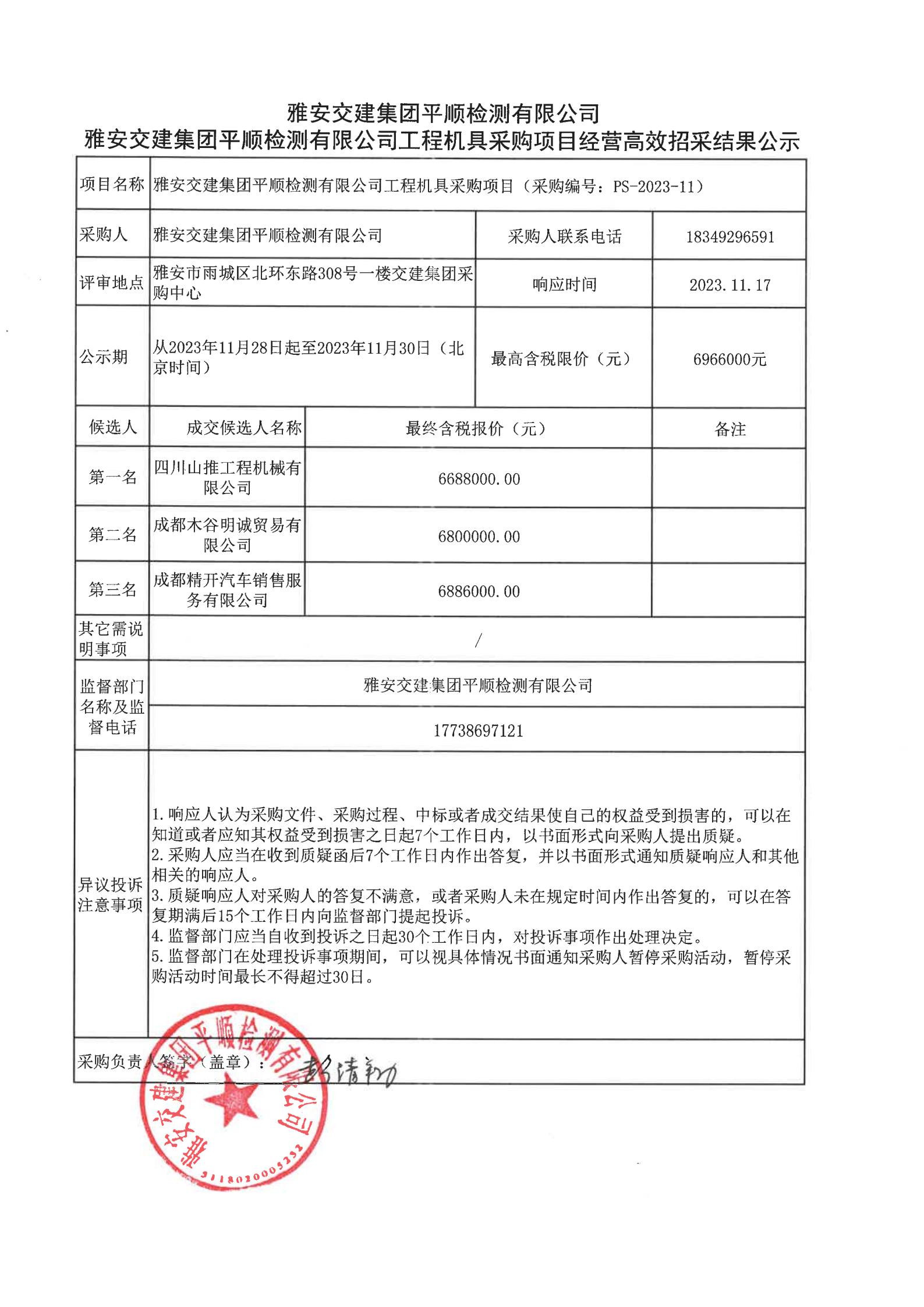 雅安交建集團平順檢測有限公司工程機具采購項目經(jīng)營高效招采結(jié)果公示