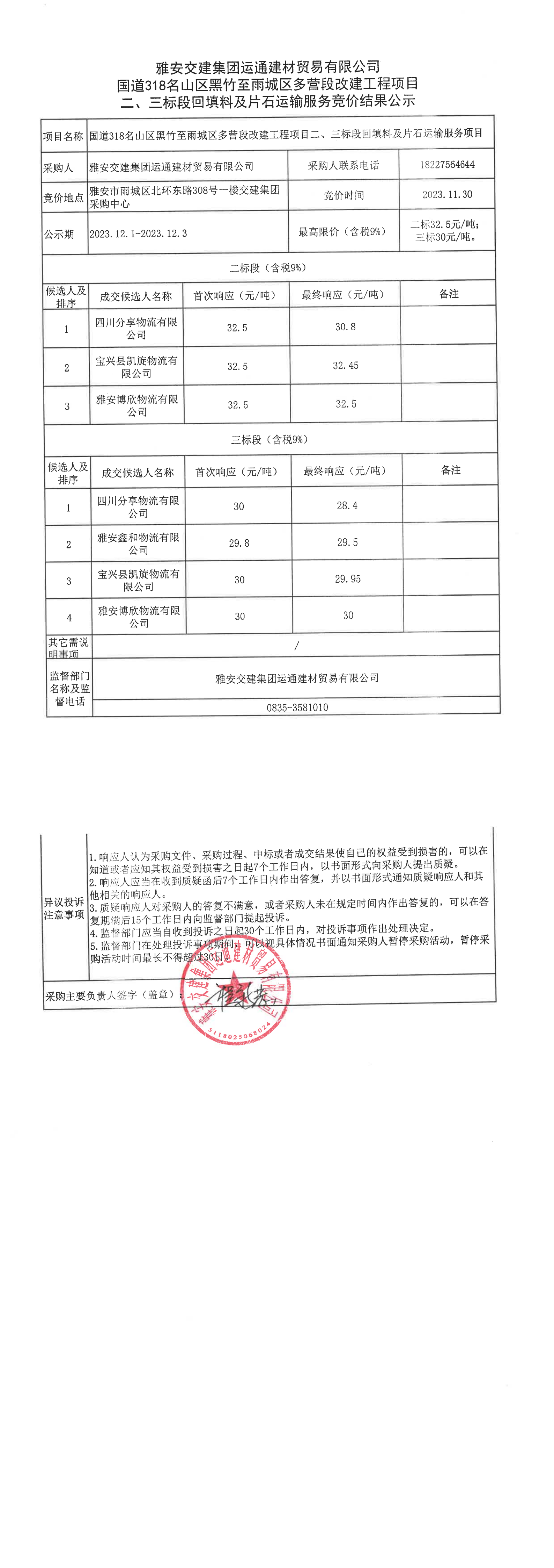 雅安交建集團(tuán)運(yùn)通建材貿(mào)易有限公司國道318名山區(qū)黑竹至雨城區(qū)多營段改建工程項(xiàng)目二、三標(biāo)段回填料、片石運(yùn)輸服務(wù)競價結(jié)果公示