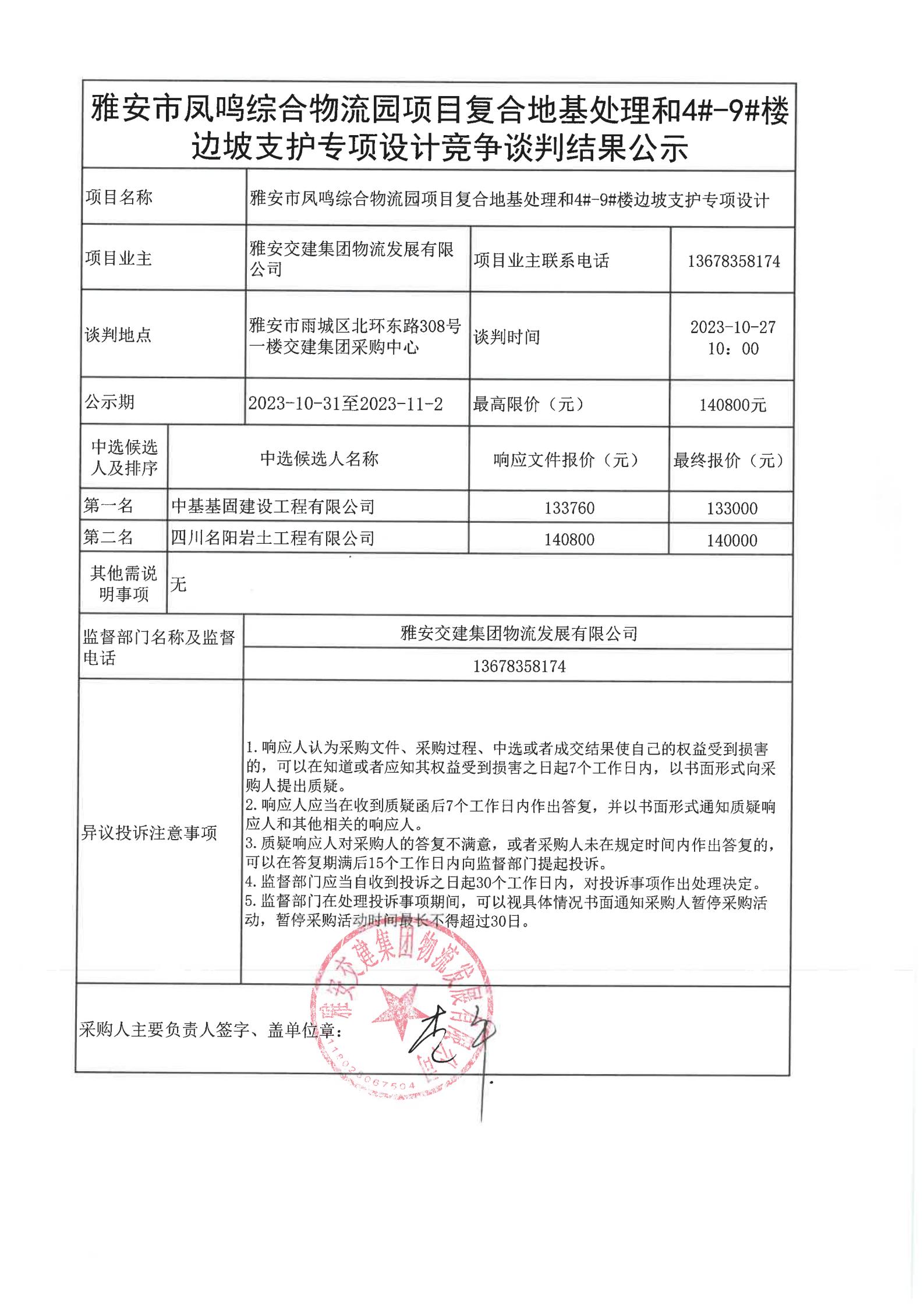 雅安交建集團(tuán)物流發(fā)展有限公司雅安市鳳鳴綜合物流園項目復(fù)合地基處理和4#-9#樓邊坡支護(hù)專項設(shè)計競爭談判結(jié)果公示