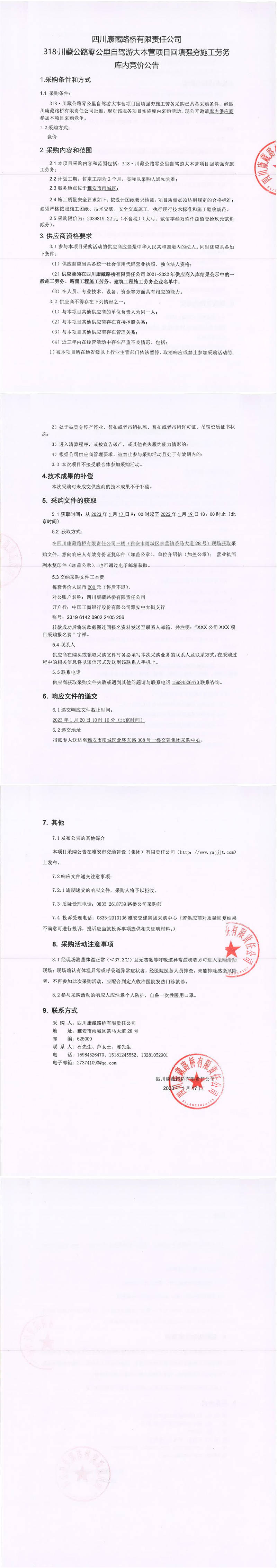 四川康藏路橋有限責(zé)任公司318.川藏公路零公里自駕游大本營項(xiàng)目回填強(qiáng)夯施工勞務(wù)庫內(nèi)競價(jià)公告