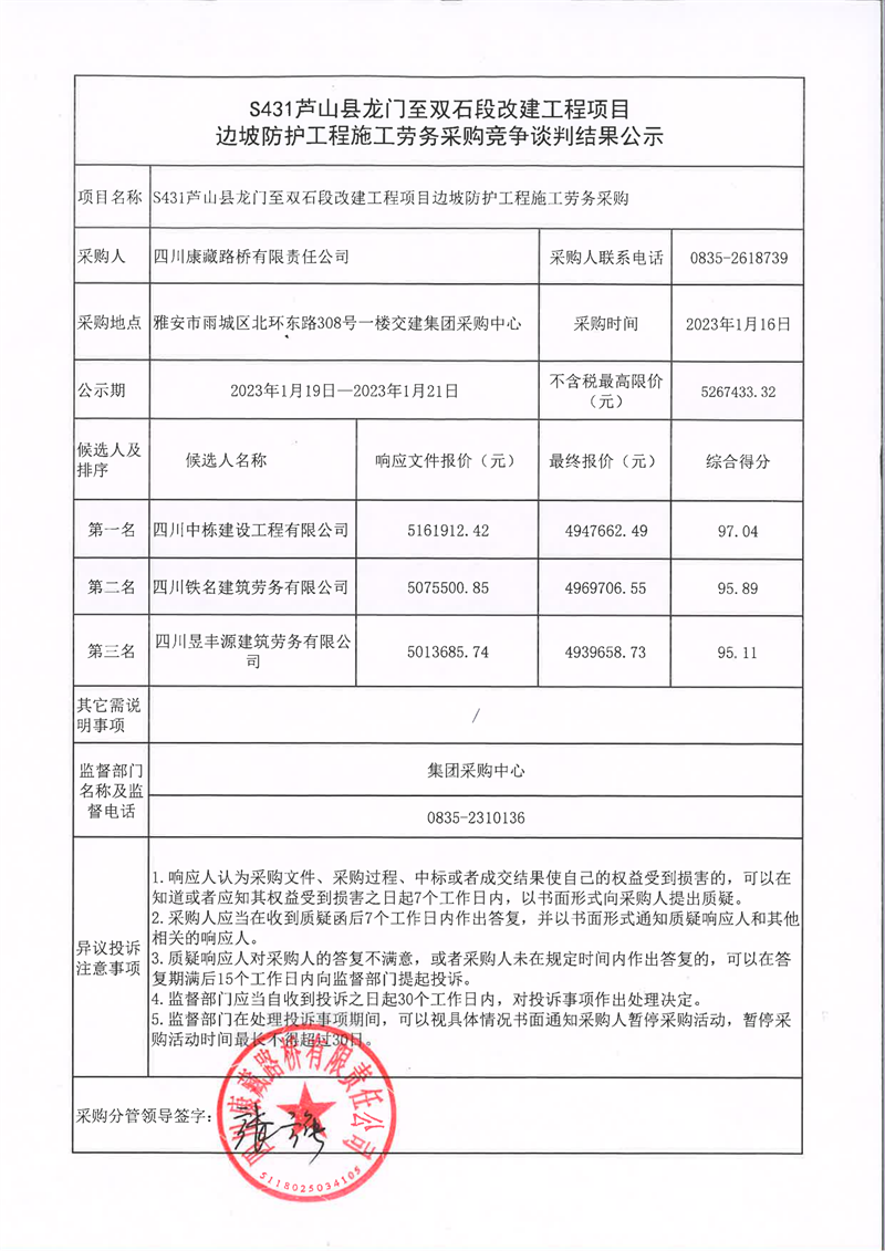 四川康藏路橋有限責(zé)任公司S431蘆山縣龍門至雙石段改建工程項(xiàng)目邊坡防護(hù)工程施工勞務(wù)采購(gòu)競(jìng)爭(zhēng)談判結(jié)果公示