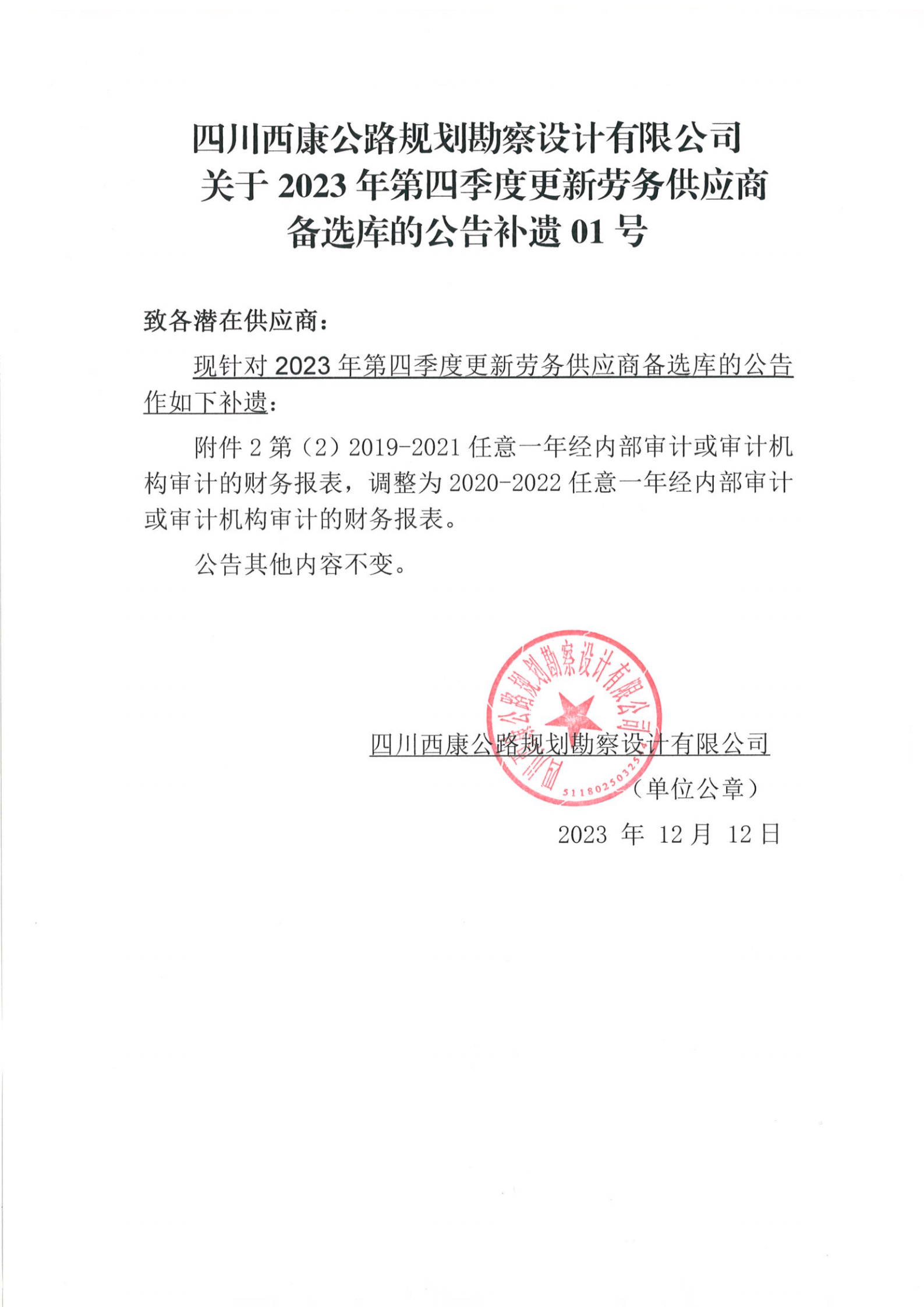 四川西康公路規(guī)劃勘察設(shè)計(jì)有限公司關(guān)于2023年第四季度更新勞務(wù)供應(yīng)商備選庫的公告補(bǔ)遺01號(hào)