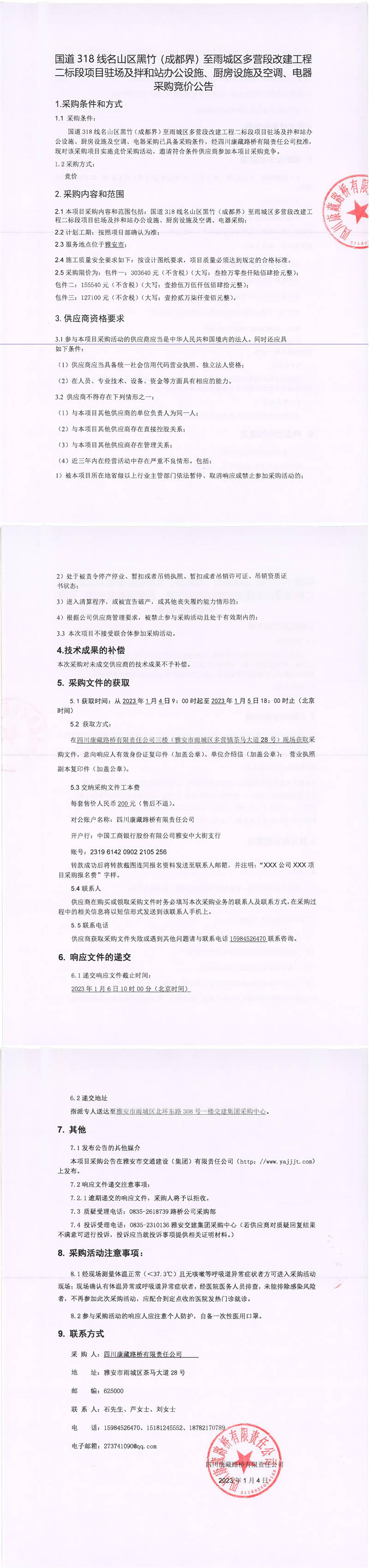 四川康藏路橋有限責(zé)任公司國(guó)道318線名山區(qū)黑竹(成都界)至雨城區(qū)多營(yíng)段改建工程二標(biāo)段項(xiàng)目駐場(chǎng)及拌和站辦公設(shè)施、廚房設(shè)施及空調(diào)、電器采購(gòu)競(jìng)價(jià)公告