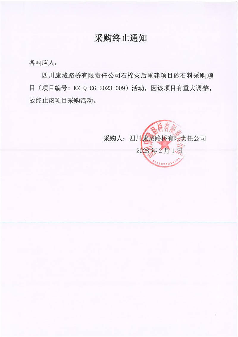 四川康藏路橋有限責任公司石棉災(zāi)后重建項目砂石料采購項目采購終止通知