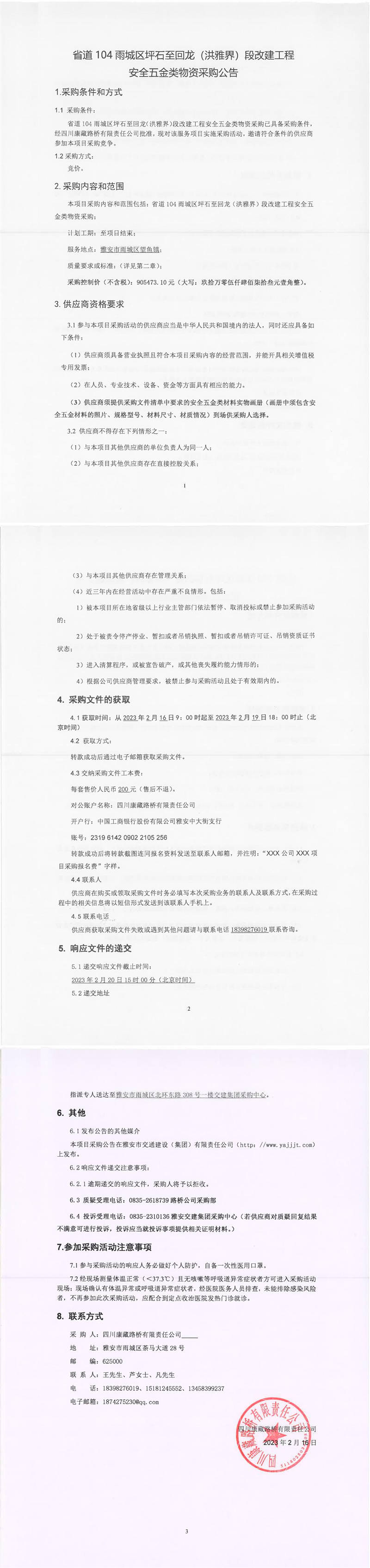 四川康藏路橋有限責(zé)任公司省道104雨城區(qū)坪石至回龍(洪雅界)段改建工程安全五金類(lèi)物資采購(gòu)公告